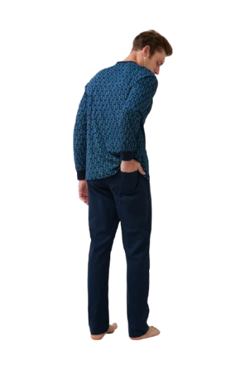 Pijama bărbați VAMP din bumbac 100% Cotton SJ, cu mânecă lungă și nasturi (placket), pantaloni lungi albastru închis, model cu imprimeu geometric