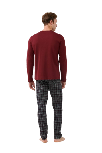 Pijama bărbați VAMP din bumbac 100% interlock, cu mânecă lungă și guler în V, pantaloni în carouri, model bordo