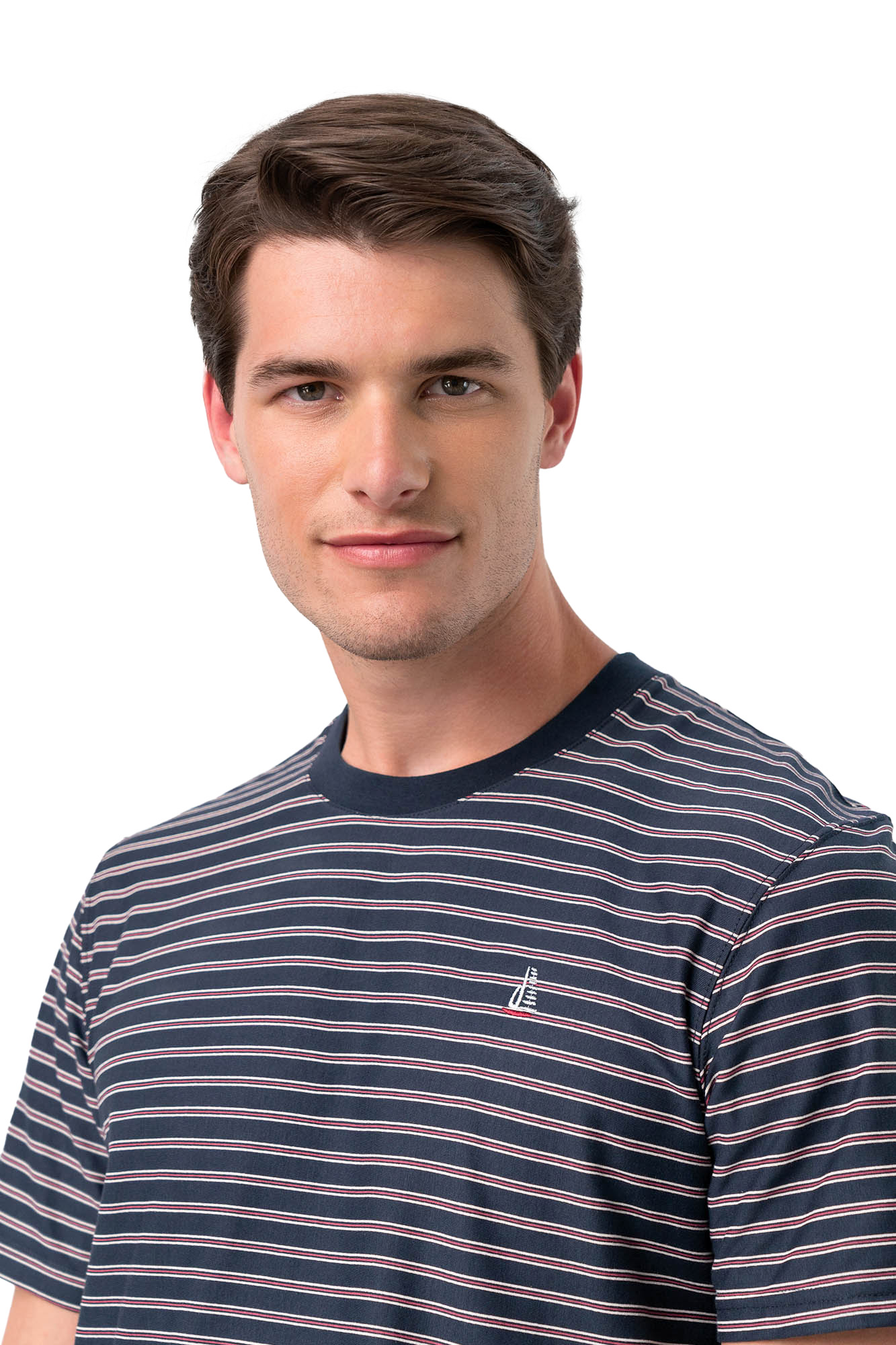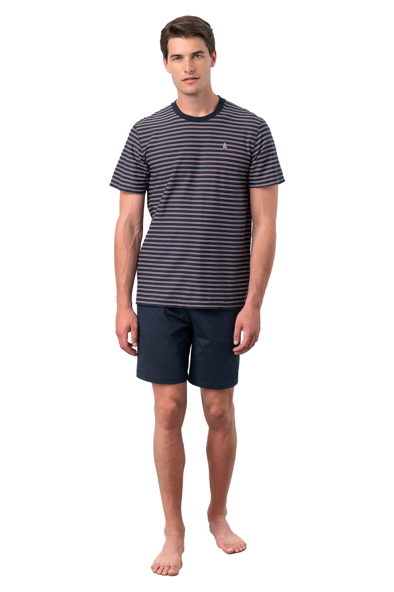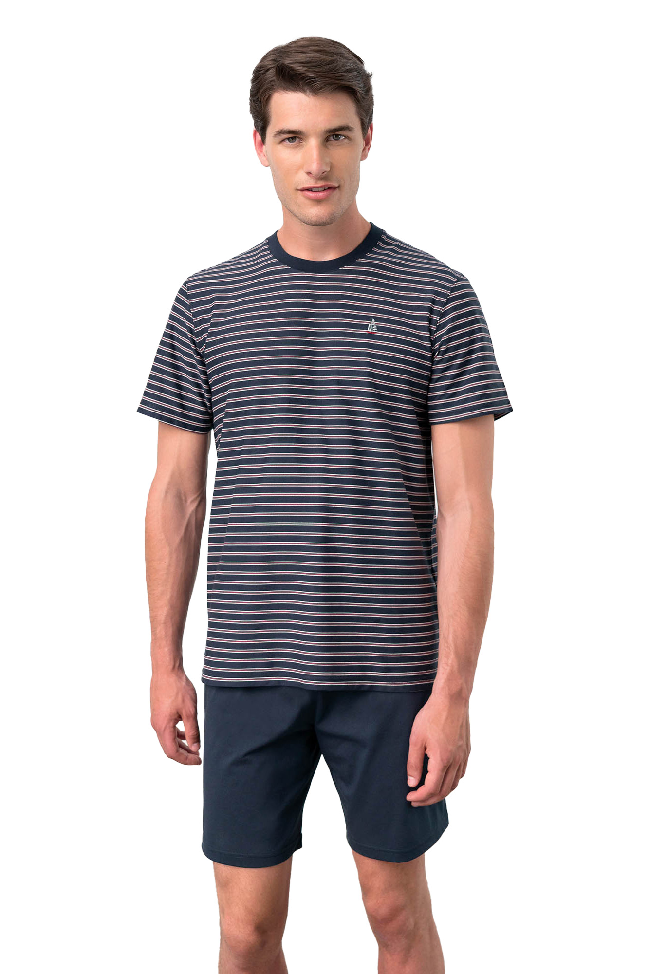 Pijama pentru bărbați Vamp, confecționată din 100% bumbac jersey, ideală pentru sezonul primăvară-vară. Materialul ușor, compact și igienic oferă un confort excelent și o purtare plăcută. Designul clasic include o bluză cu decolteu rotund la baza gâtului, decorată cu dungi orizontale și un logo brodat discret pe piept, adăugând un aer modern și rafinat. Pantalonul tip bermudă, cu talie medie elastică și buzunar la spate, completează setul cu un aspect practic și relaxat. Această pijama este potrivită pentru orice tip de siluetă, fiind perfectă pentru confort și stil în zilele calde.