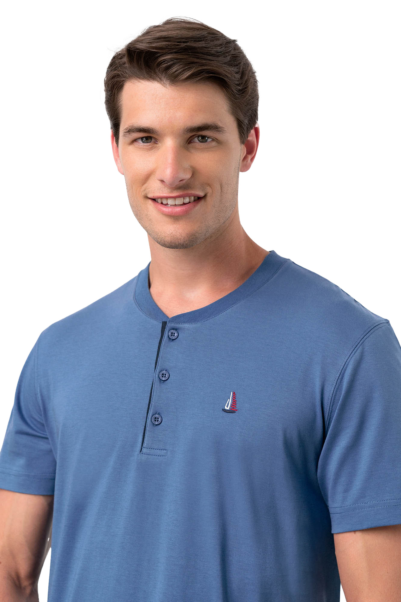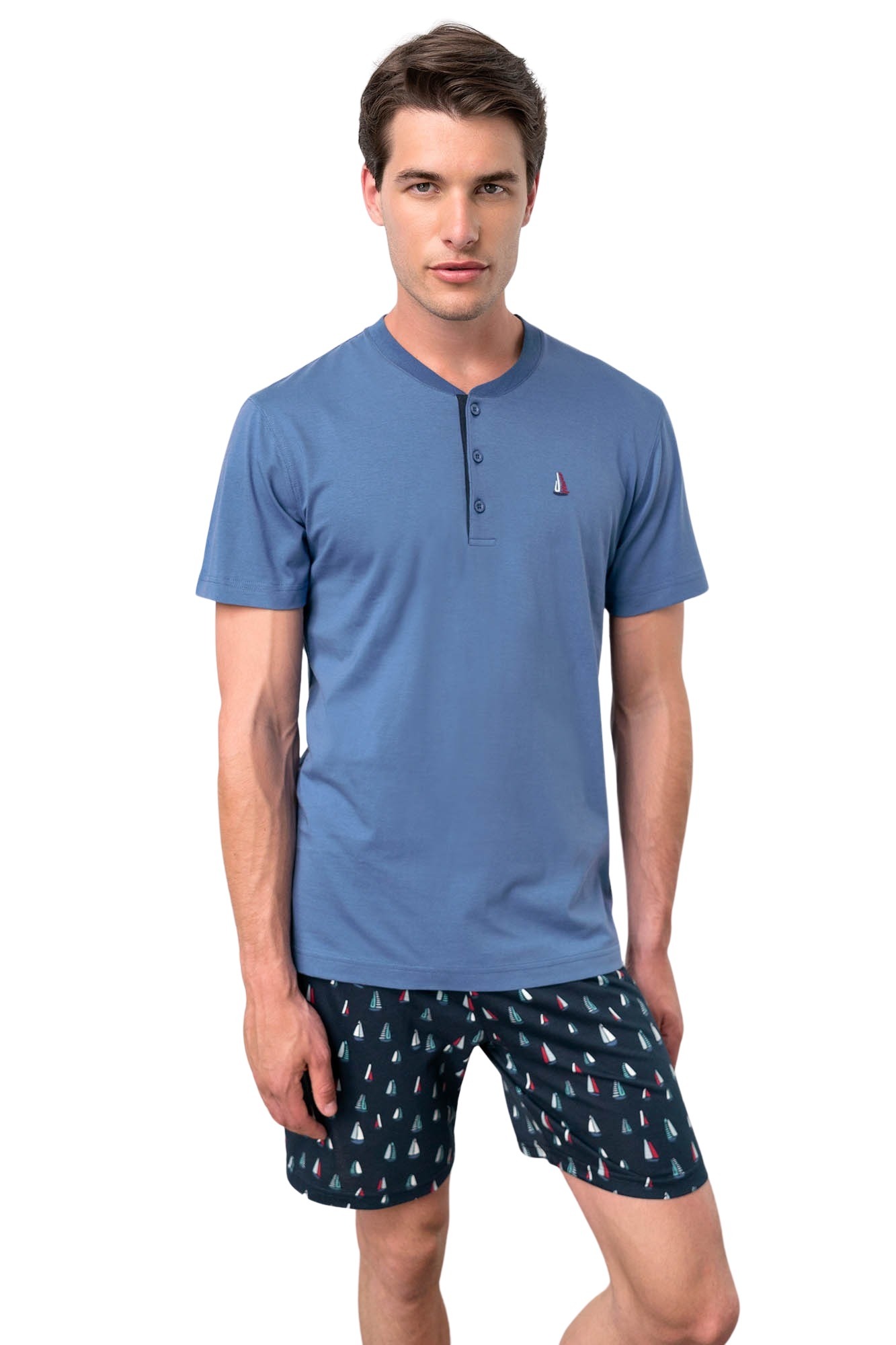 Pijama pentru bărbați Vamp, confecționată din 100% bumbac jersey, perfectă pentru sezonul primăvară-vară. Materialul ușor, compact și igienic asigură un confort excelent și o purtare plăcută. Designul clasic include o bluză cu fenta și 3 nasturi funcționali, împreună cu un logo brodat discret pe piept. Pantalonul tip bermudă, cu talie medie elastică și buzunar la spate, completează setul cu un aspect relaxat. Imprimeul cu elemente mici de bărci cu vele adaugă un detaliu nautic, ideal pentru zilele calde. Produsul este potrivit pentru orice tip de siluetă, oferind confort și stil.