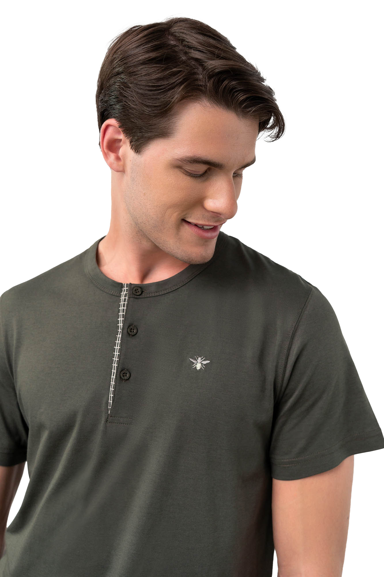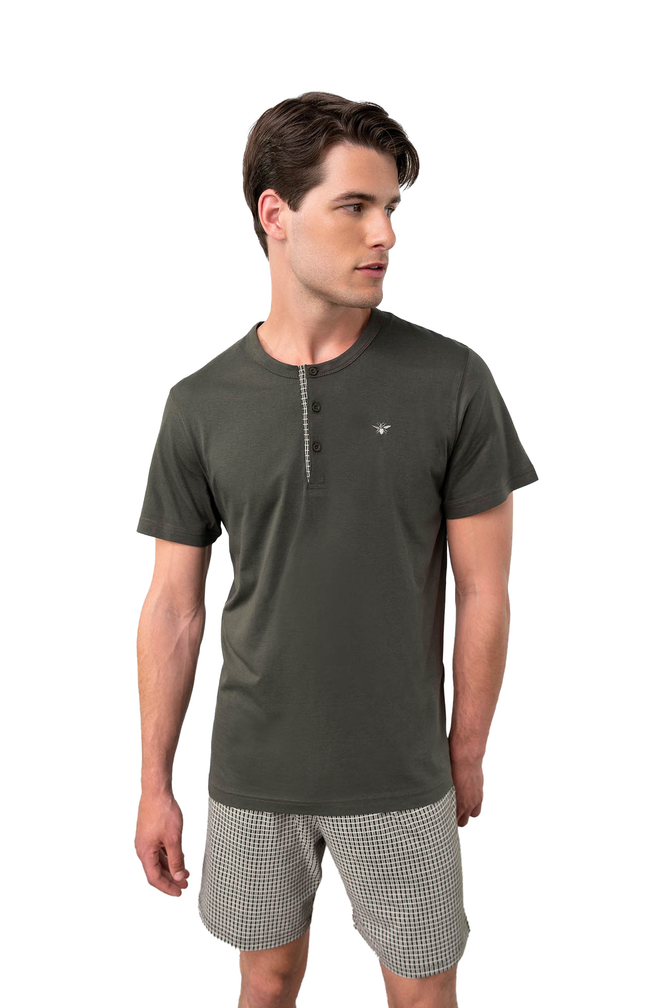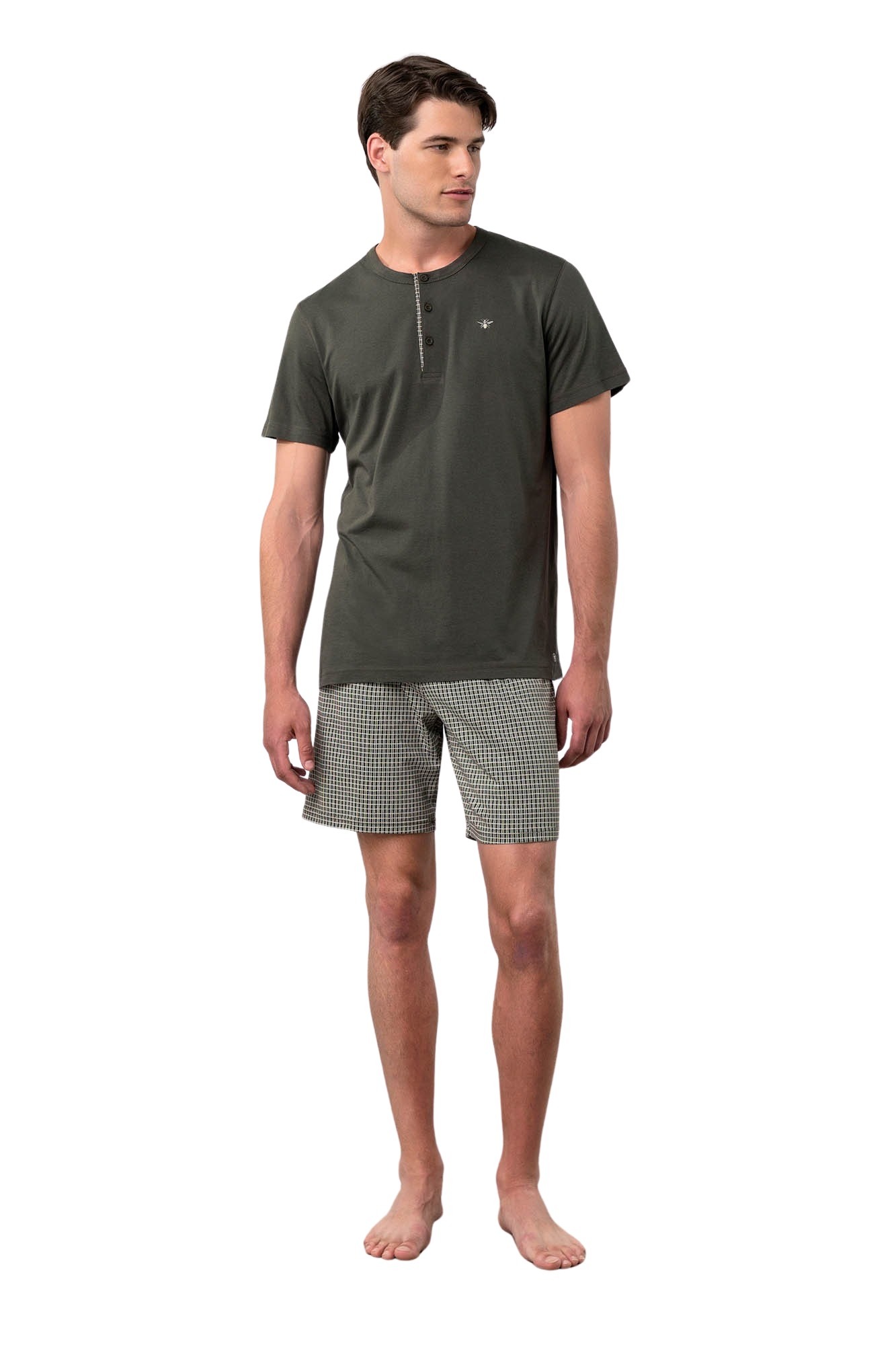 Pijama de barbati Vamp, realizata din 50% bumbac 50% modal extras din lemn de fag. Materialul mixt este deosebit de placut la purtare, avind un touch deosebit. Croiul este clasic, cu fenta cu 3 nasturi functionali. Pantalonul este tip bermuda, si are talie medie elastica si buzunar la spate. De asemenea, este imprimat in carouri simple liniare. Pe piept este brodat logo discret. Produsul este potrivit pentru orice tipologie de corp.