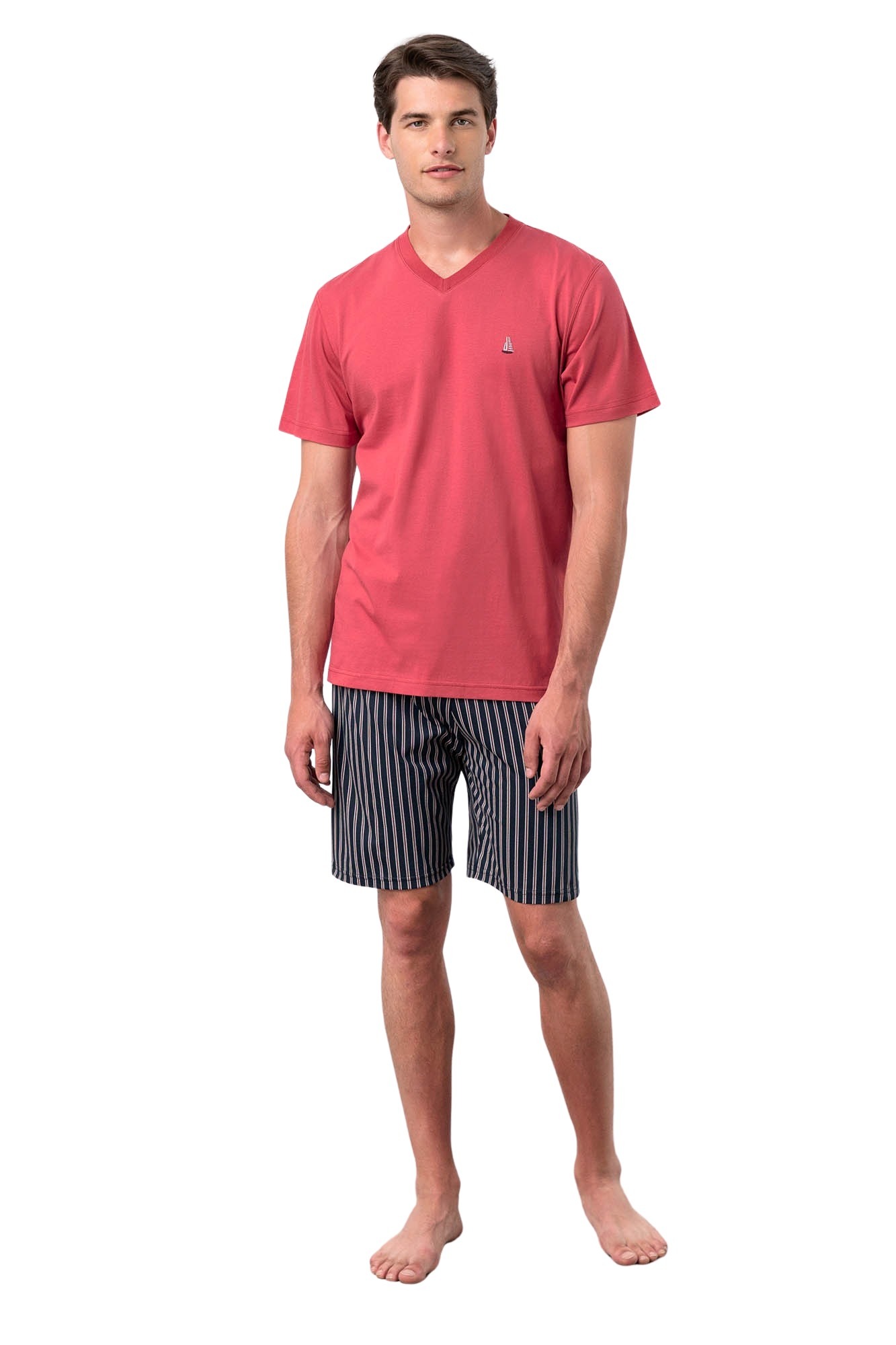 Pijama pentru bărbați Vamp, confecționată din 100% bumbac jersey, ideală pentru sezonul primăvară-vară. Materialul ușor, compact și igienic oferă o senzație plăcută la purtare. Designul clasic include o bluză cu decolteu tip anchior și un logo brodat discret pe piept, adăugând o notă elegantă. Pantalonul tip bermudă are talie medie elastică, buzunar la spate și un imprimeu cu dungi verticale, care completează aspectul stilat. Potrivită pentru orice tip de siluetă, această pijama combină confortul cu un design modern și funcțional.