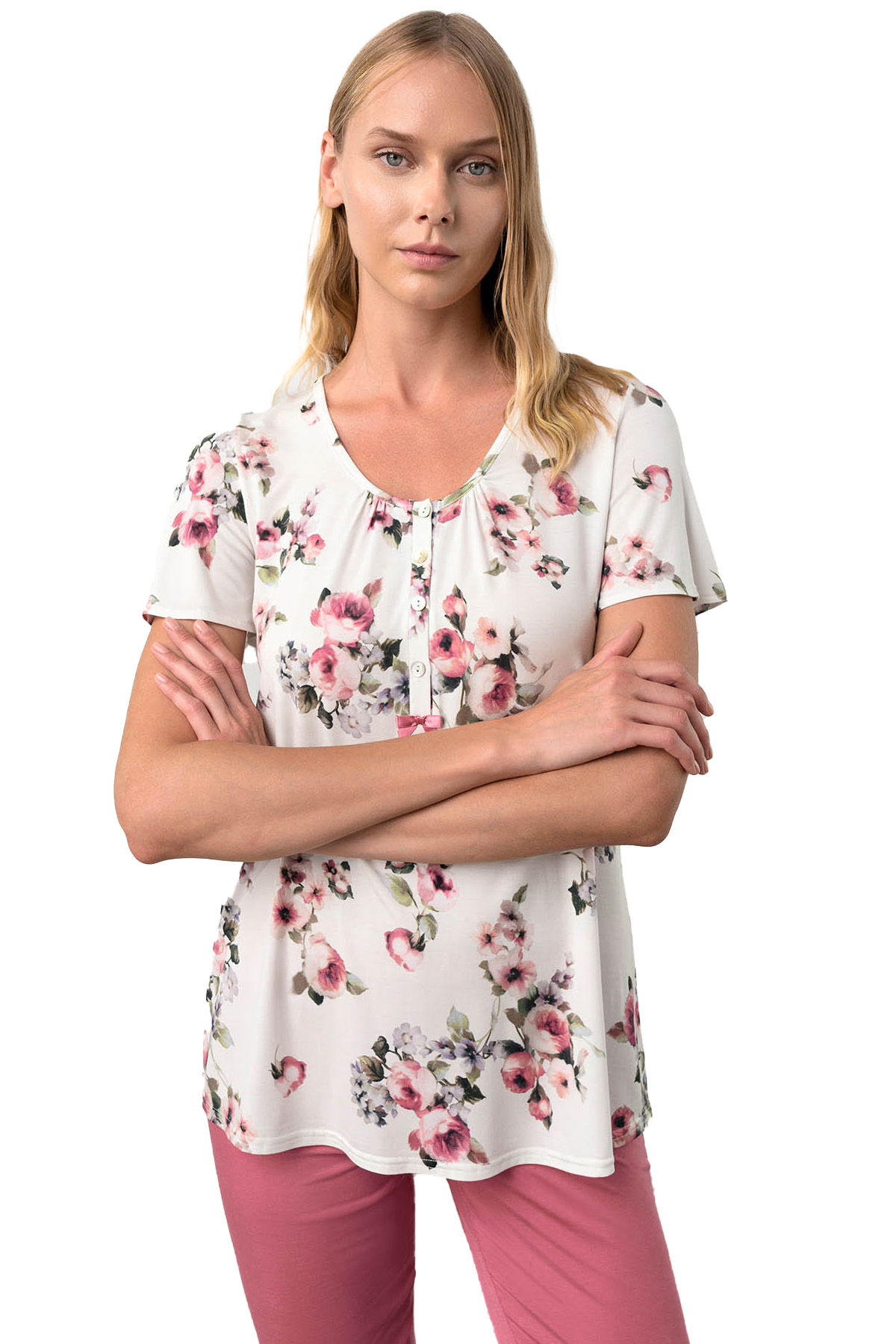 Pijama de damă Vamp, realizată dintr-un amestec de 50% bumbac și 50% modal, extras din lemn de fag. Materialul este extrem de confortabil și plăcut la atingere.