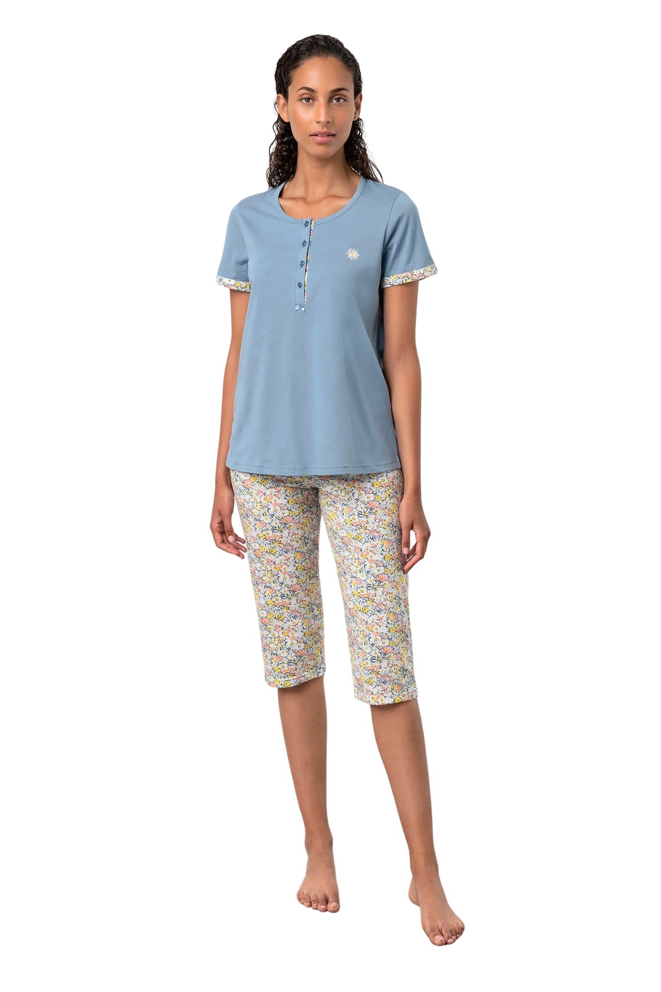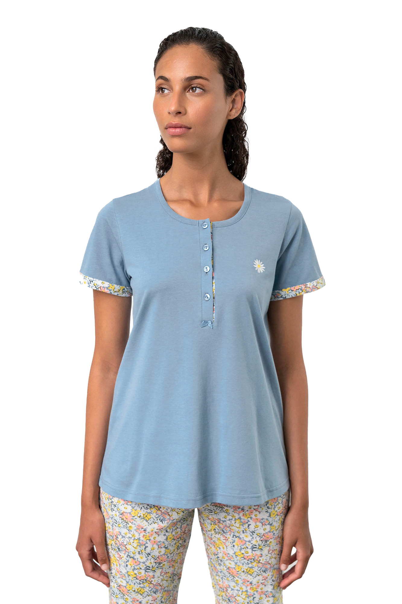 Pijama de damă Vamp, confecționată din 100% bumbac jersey, perfectă pentru sezonul primăvară-vară. Materialul este ușor, compact, igienic și extrem de plăcut la purtare. Croiul clasic include o bluză de 68 cm lungime, cu o fenta decorativă și 5 nasturi funcționali. Pantalonii au talie medie elastică pentru un confort sporit. Ideală pentru orice doamnă care iubește culorile verii și confortul maxim.